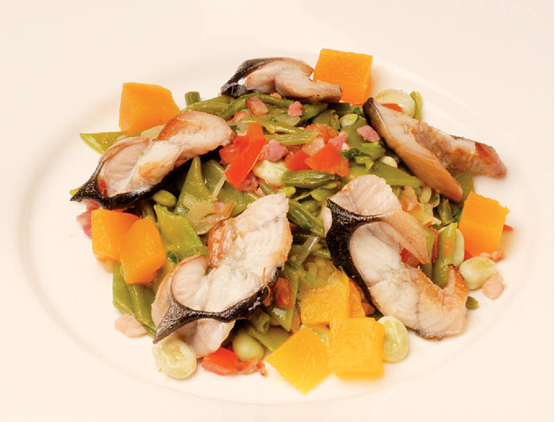 Räucheraal auf dreierlei Bohnengemüse im Kartoffelschnee |