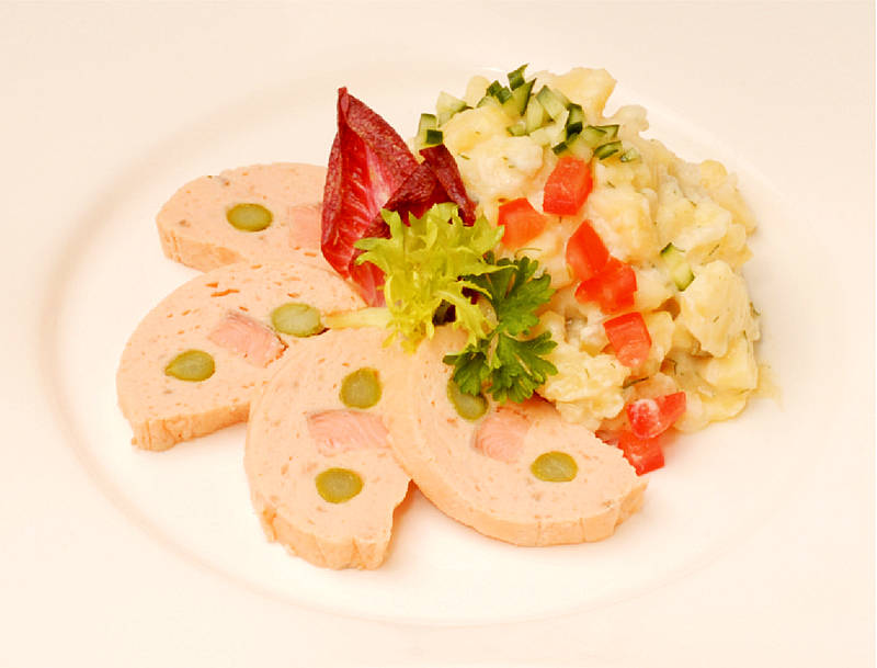 Lachsterrine mit Kartoffelsalat, Rote-Beete und Holsteiner Aromies |