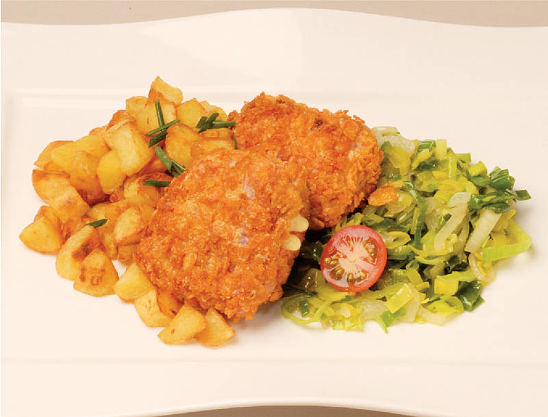 Holsteiner Katenrauchschnitzel aus der Pape, mit gereiftem Käse, Rösties und Lauchgemüse |