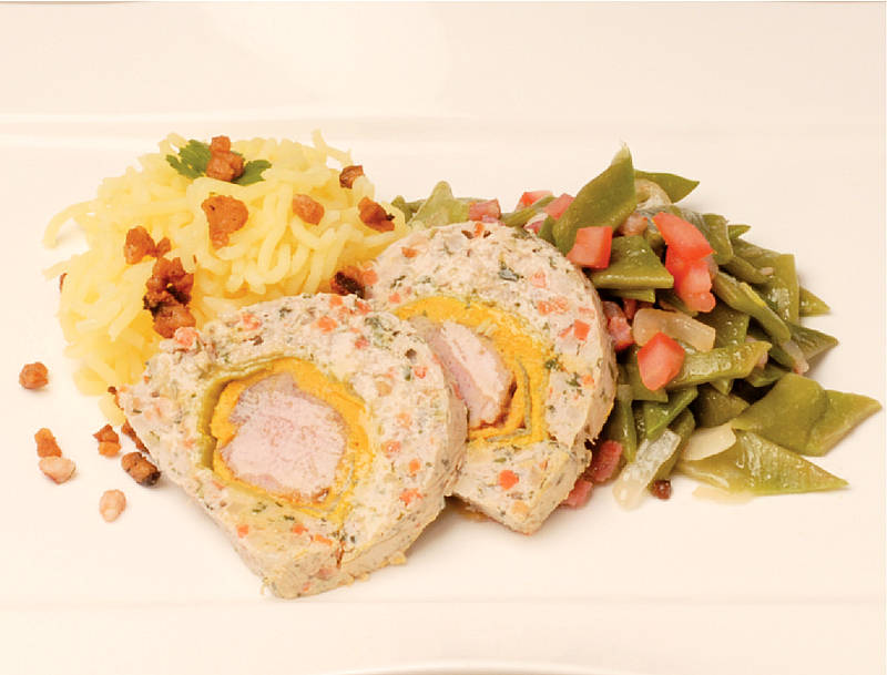 Roulade aus Schweinelachs und Katen-schinken mit Krautfüllung auf Auflaufgemüse |