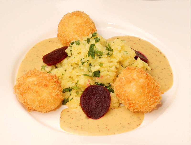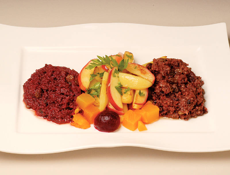 Lammbällchen in Kapernsauce mit Rübenmalheur und Rote Beete |