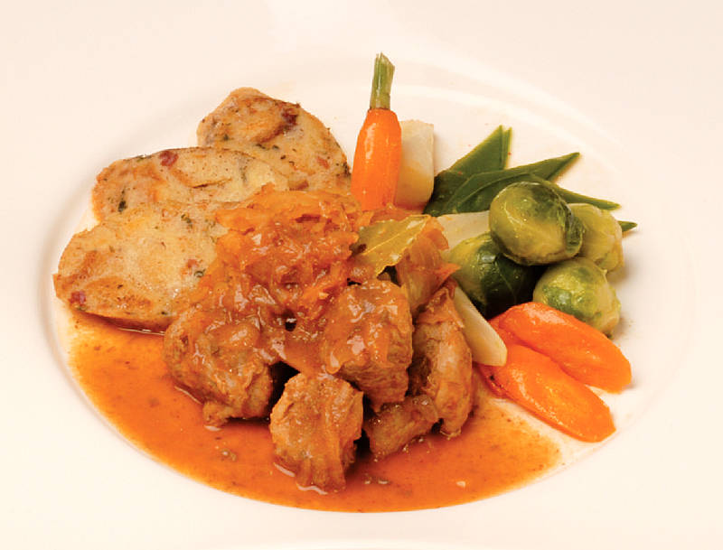 Sauerkraut-Gulasch mit Serviettenknödel auf Dithmarscher Feldgemüse |
