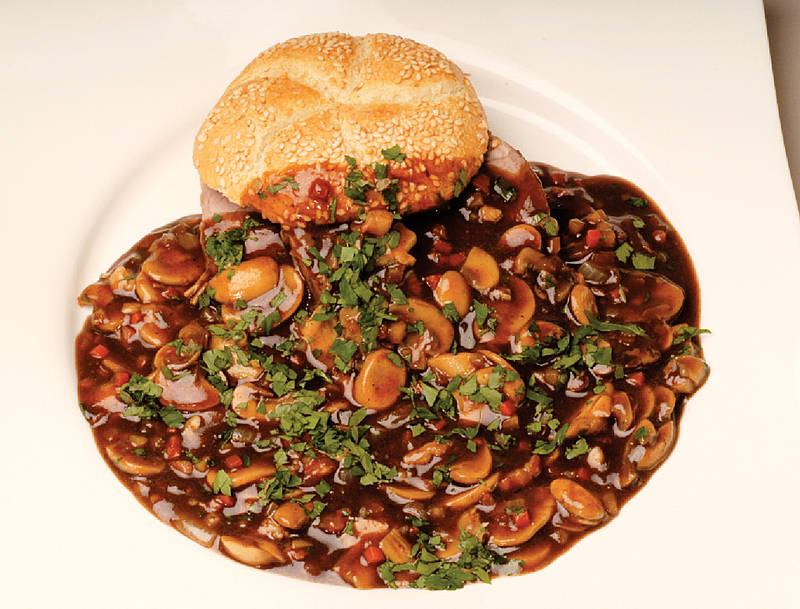 Der Vorläufer vom Burger mit uralter Tradition. Bratenscheiben im Brötchen mit Pilzbratensauce |