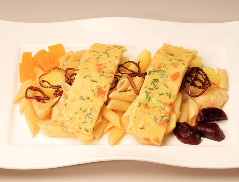 Gemüseomelett auf Mix von Mehlklöße, Kartoffeln und Nudeln mit Röstzwiebeln |