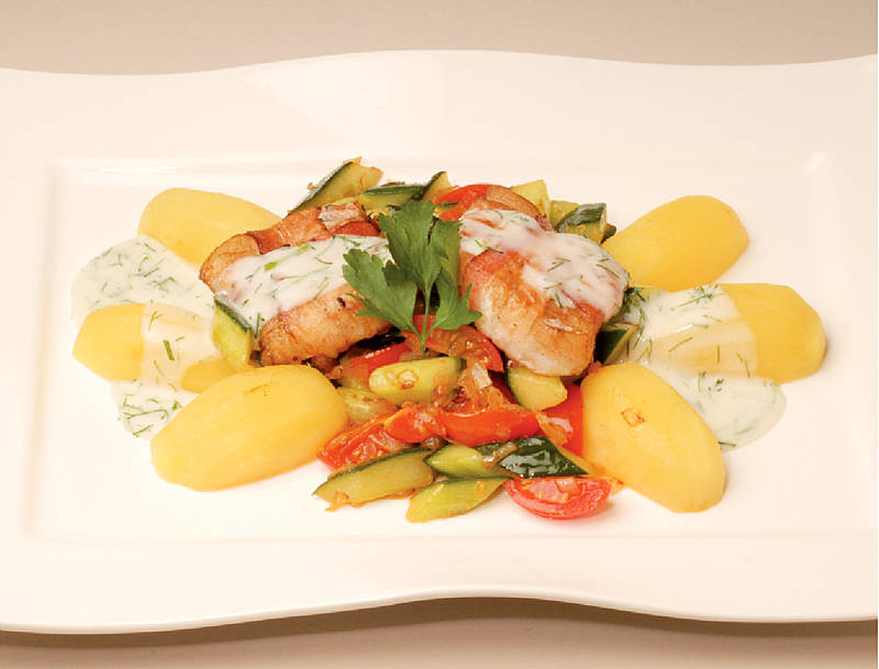 Barschfilet im Speckwickel mit Petersilienkartoffel, |