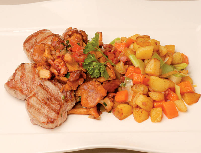 Steakletten von der Schweinelende mit Pilzgemüse und Bratkartoffeln |