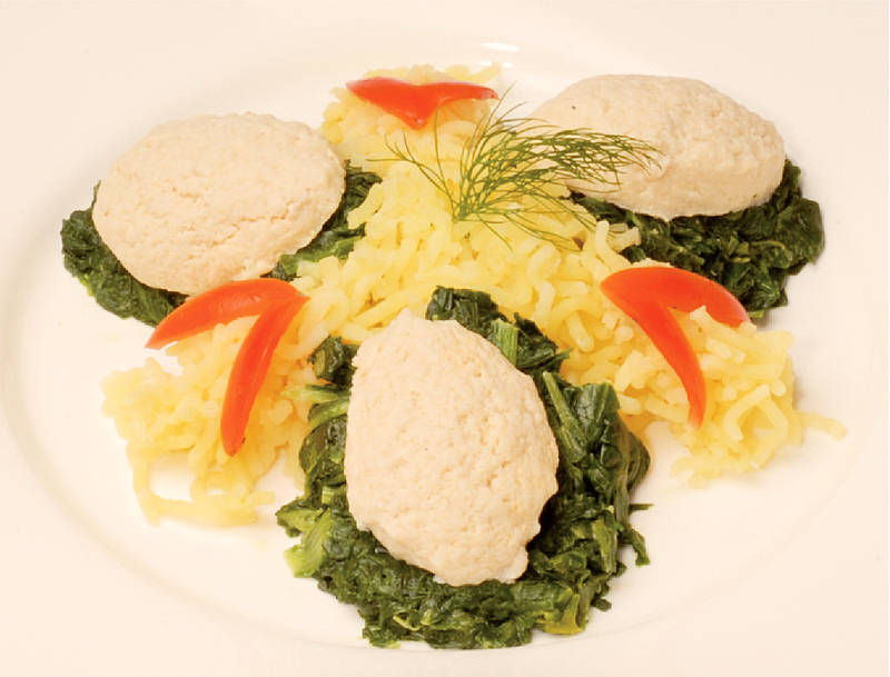 Hechtklöße auf Blattspinat und Kartoffelschnee |
