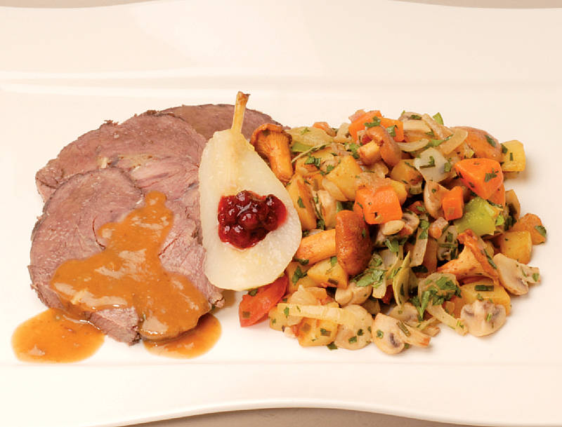Hasenrückenfilet im Wirsingmantel auf Rübenmalheur mit fruchtigen Aromies |