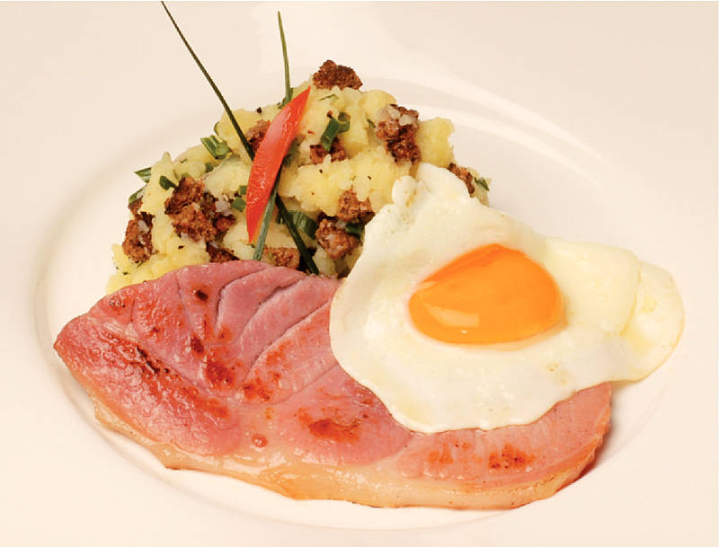 Katenschinken auf Schwarzbrotstampf mit Spiegelei |